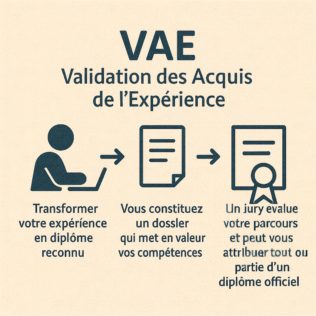 La VAE (Validation des Acquis de l’Expérience) permet de transformer votre expérience en diplôme reconnu.